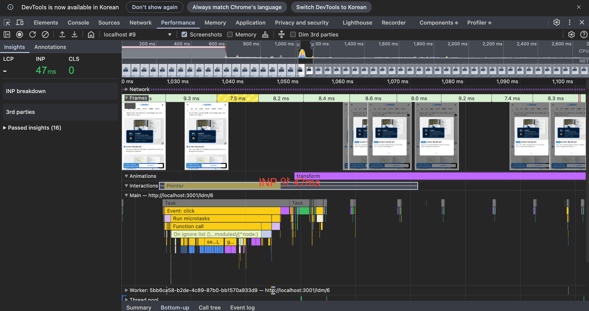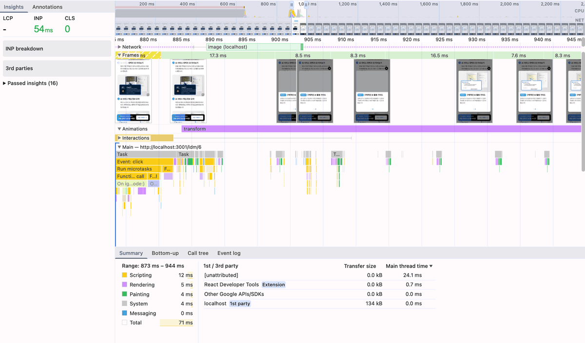 5번에서 슬라이더 내부의 구조가 복잡하여 메인 스레드에서 레이아웃 연산이 한번에 몰리고 작업 시간이 약 60ms를 넘어서는 것이다. (최상단 스크린샷 참고, 16ms를 넘으면 사람 눈에 포착된다.)