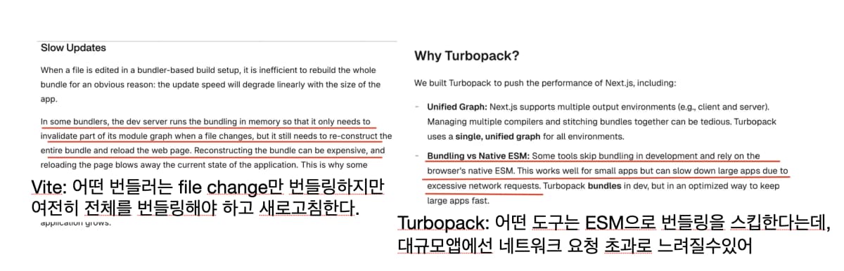 그러다 Next에서는 rust로 만든 turbopack이 나오면서 번들링을 아주 빠르게 처리하고, vite는 자주 변경되는 소스코드는 브라우저 네이티브 ESM을 이용하는 컨셉으로 세상에 등장했다.