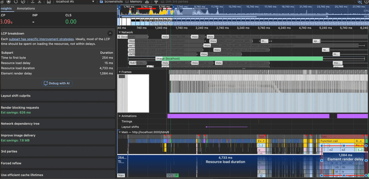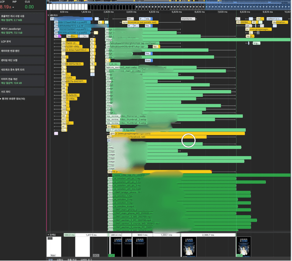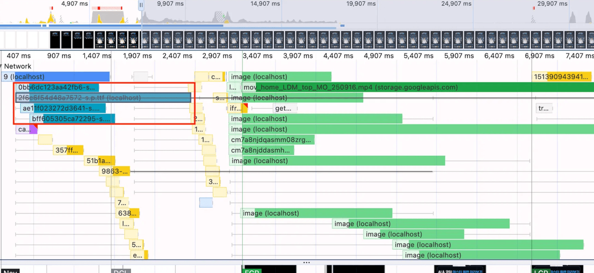 이미지 쪼개기를 했지만 lazy loading이 안되어있고, mp4영상이 많아서 네트워크 경쟁이 심한 상태였다.