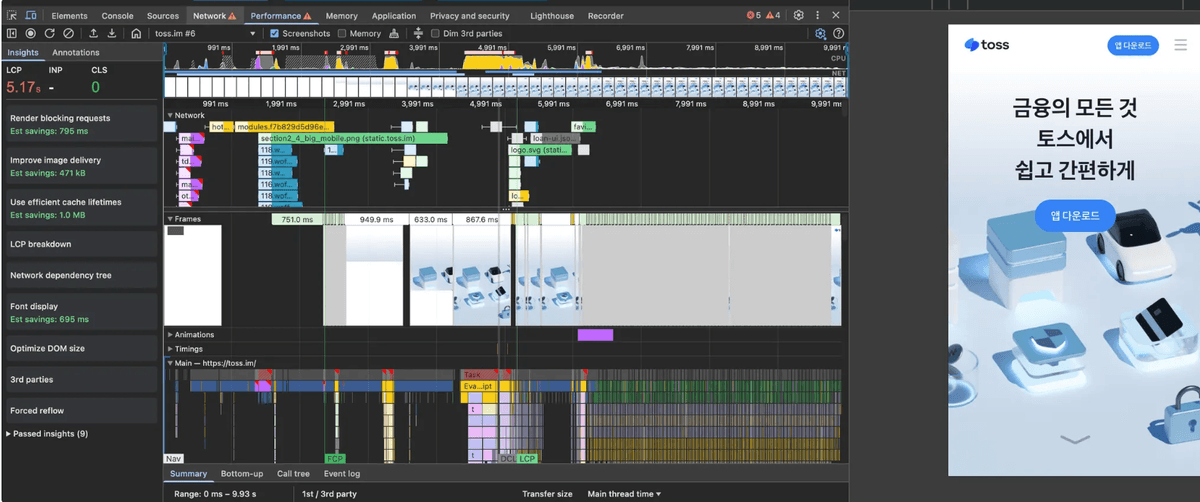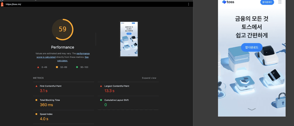 - 비교군을 위해 동일 환경(mobile, fast 4g, cpu 4x slowdown)에서 토스를 측정한 모습은 다음과 같이 performance 탭 LCP는 5.17s, light house는 59점이다.