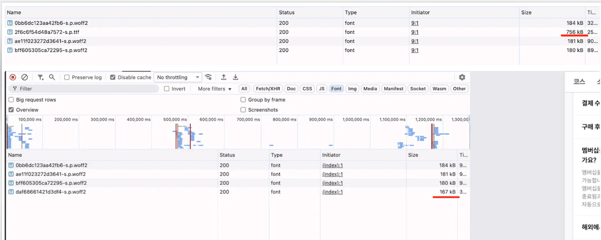 ttf하나가 길게 늘어지고 있어서 subset woff2로 변경하니 756kb에서 167kb로 경량화되었다. (subset은 한글, 영어, 숫자들만 다운받았다.)