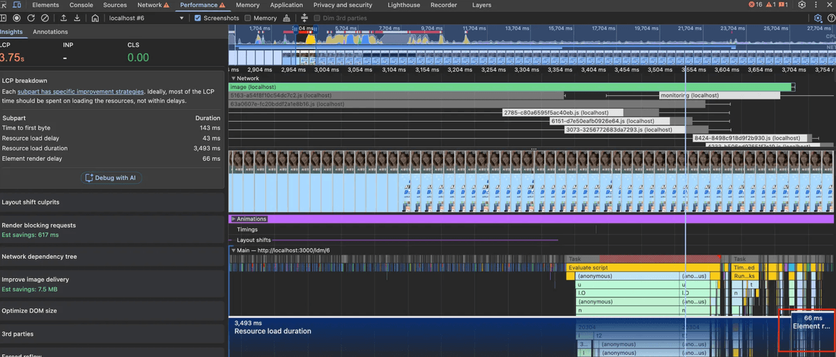 그 이후에도 추가 개선할 수 있는 방법을 찾기 위해 퍼포먼스탭을 살펴 보았는데 FCP와 LCP에서 문제점을 찾을 수 있었다.