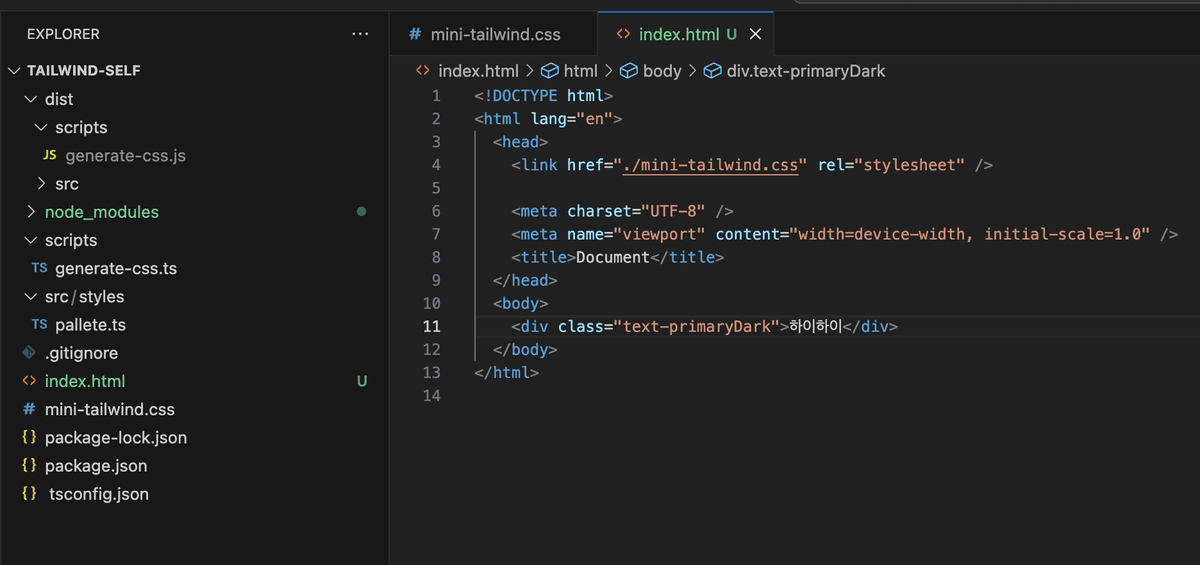 아래와 같이 index.html을 만들고 빌드된 css mini-tailwind.css를 연결, 약속된 class text-primaryDark 를 입력했다.