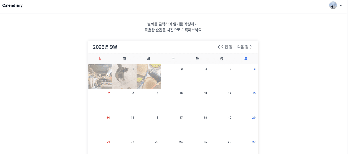 - 유저는 캘린더의 각 날짜를 클릭하여 텍스트와 이미지 업로드를 통해 일기를 작성 할 수 있다.