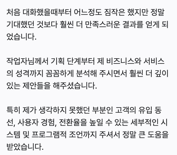 외주 하면서 고객의 이야기속에서 문제를 정의하고 해결책을 제안하는 것은 전에는 하지 못한 경험이었다. 단가를 조금이라도 올리면 고객은 나를 싫어하게 된다는 것을 알게 되었다. 천천히 올릴 생각을 하지 말고 애초에 높게 잡던가 아니면 양치기 전략으로 가던가 해야 한다.