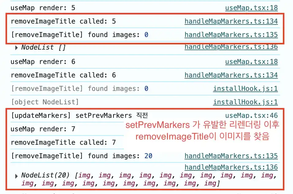 removeImageTitle()은 불필요한 setPrevMarkers 가 유발하는 리렌더링에 우연히 의존하여 정상작동 하던 것이었다.